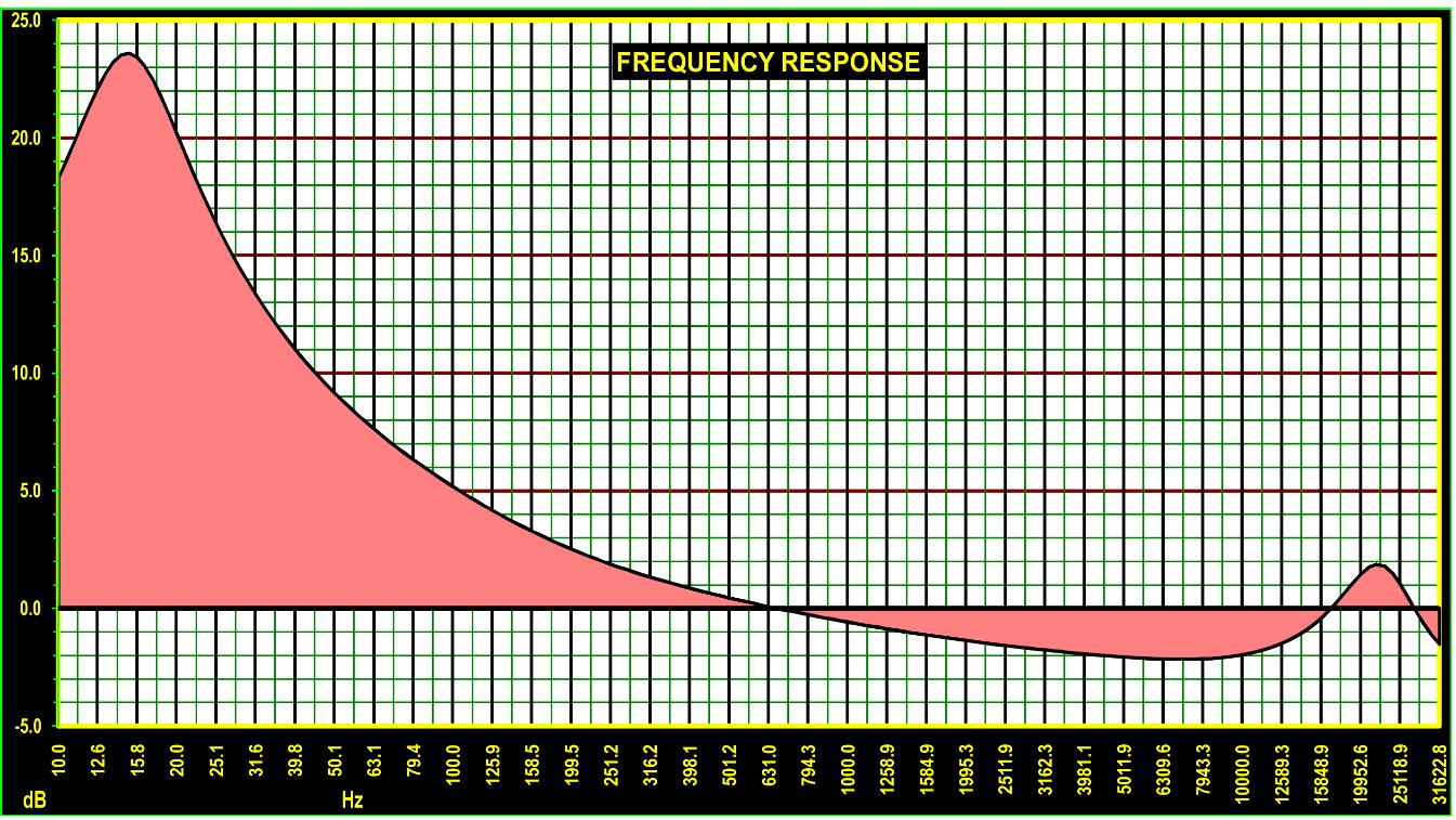 Bass boost at 15 Hz is 24 dB above the 1,000 Hz level, 10 dB more than the Balanced boost. High frequencies are down an extra dB and 20 kHz is still up 2